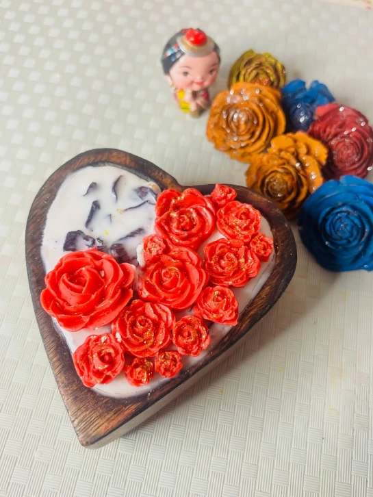 This handmade candle features a rustic wooden bowl as its container, filled with creamy white soy wax that forms a smooth base.At the center, "I LOVE YOU" is written in small, playful letters with a matching heart symbol, making it a romantic, personalized gift ideal for Valentine's or special occasions.
