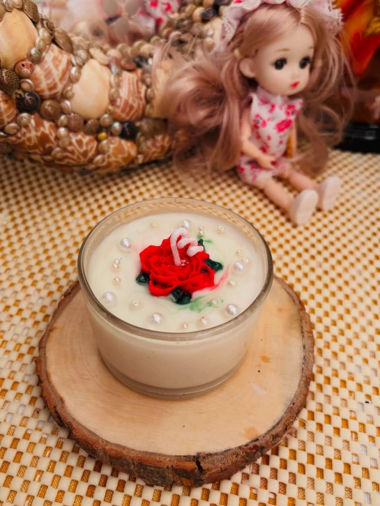 This handmade candle sits in a clear glass jar with straight sides, filled with smooth, creamy white soy wax that has a glossy pearl-like sheen. At the center, a large, detailed red rose made of colored wax sits prominently, accented by small green and red stripes mimicking a candy cane or holly sprig for a festive holiday touch.